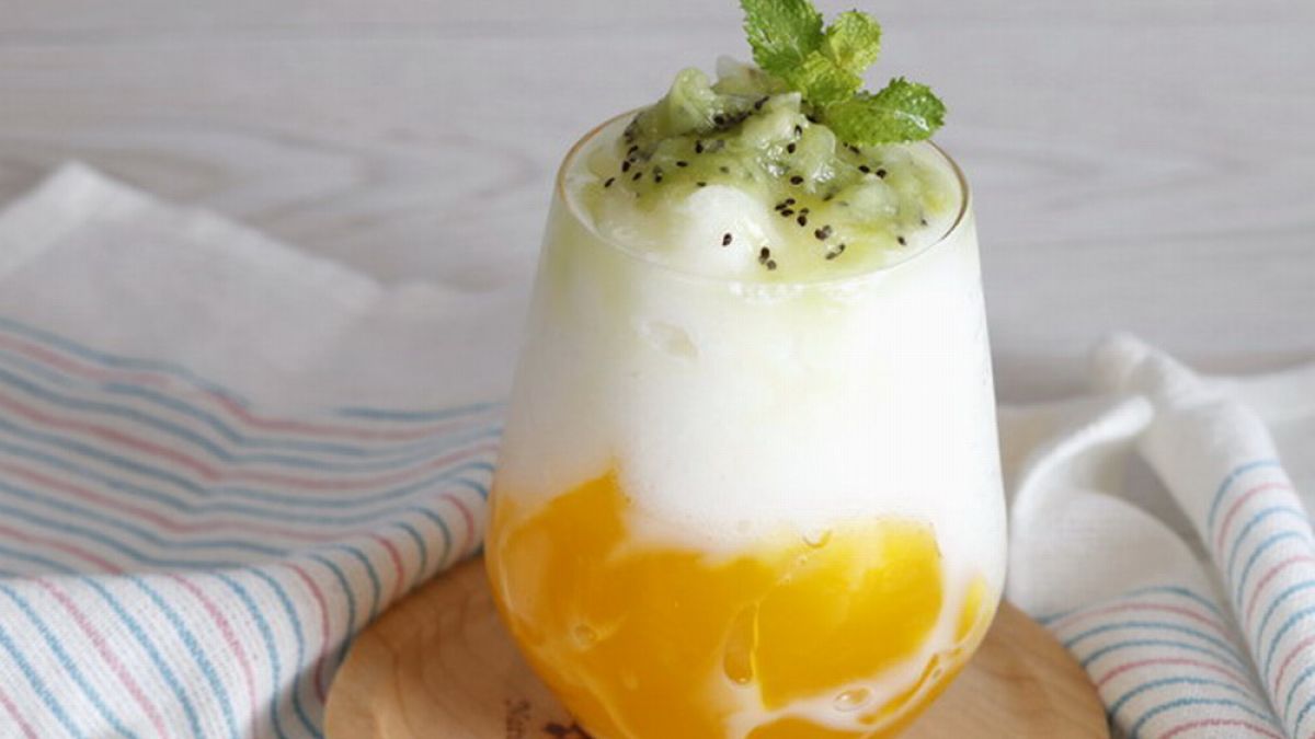 飲品頂端以奇異果泥及薄荷葉裝飾,