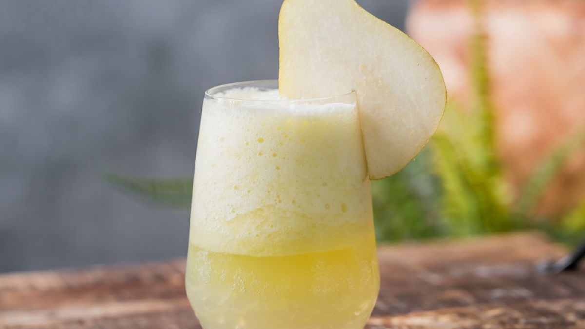 2. 冰沙機加入西洋梨、茉香綠茶、檸檬汁、葡萄柚汁、蜂蜜、青葡萄風味糖漿、碎冰攪打均勻,倒入成品杯中