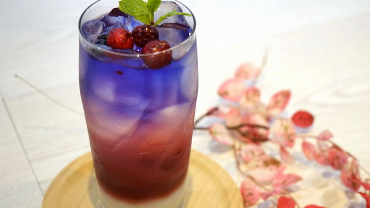 今夏最夯的蝶豆花,將飲品渲染成夢幻色彩,以優酪思果乳酸菌飲料與莓果風味糖漿調味,讓飲品除了有乳酸菌飲料的酸,更多了果漾滋味,味覺與視覺雙重享受!
