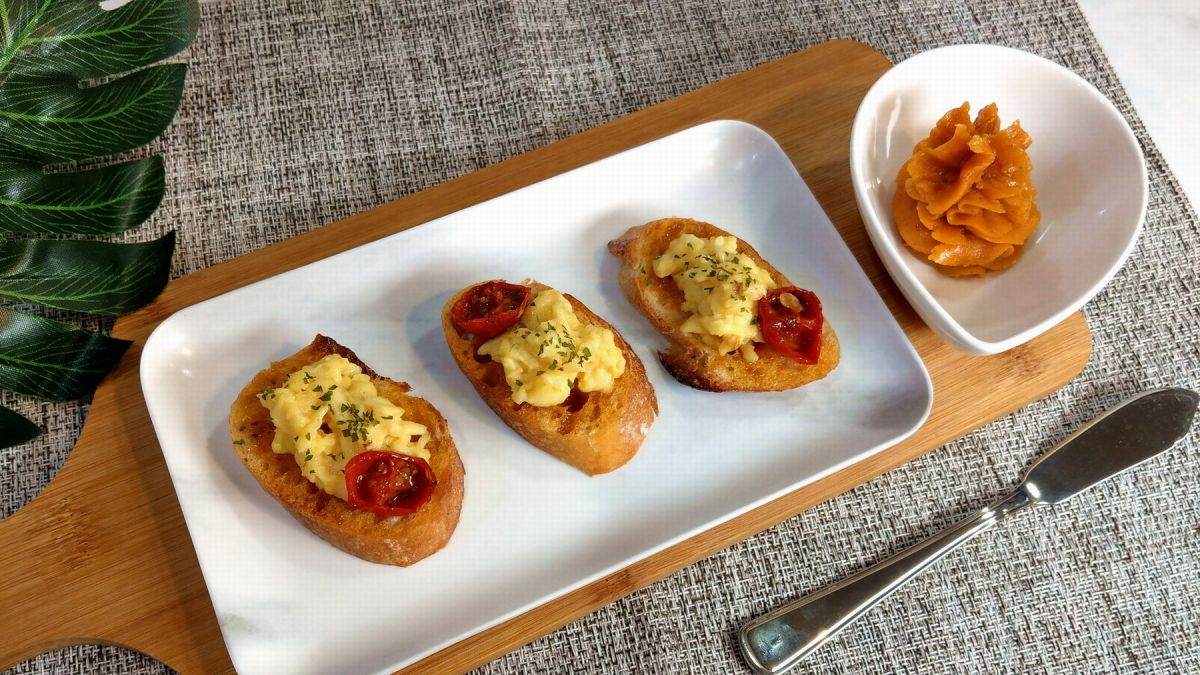以美式炭烤調味粉製做的美式炭烤巴特塗抹在麵包上,讓麵包不需經過烤箱烘烤,也能擁有炭烤香氣和烤炙後的獨特風味。完成的美式炭烤巴特佐麵包片,可以依據喜好搭配炒蛋及蕃茄片,非常美味呦!