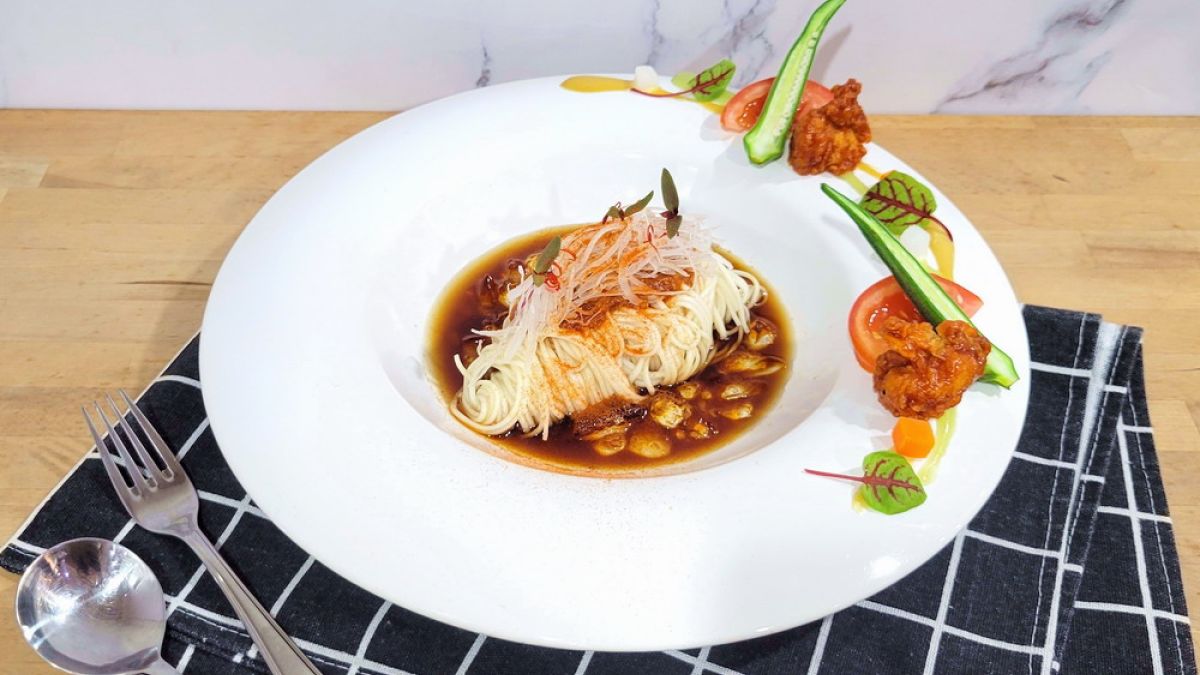 4. 取出作法3中的白圓盤,中間凹下處捲入韓式冷麵,淋上韓式冷麵醬汁,放上洋蔥蘿蔔絲.紅覓菜葉,撒上少許辣椒粉,麵體周圍倒入柴魚汁,撒上少許冰塊,即可